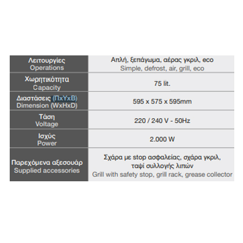 Χαρακτηριστικά:• Ηλεκτρονικός χρονοδιακόπτης με VFD οθόνη ενδείξεων • Εσωτερικός φωτισμός 25 W • Διπλό κρύσταλλο ασφαλείας • Μοντέρνο κυλινδρικό χερούλι πόρτας